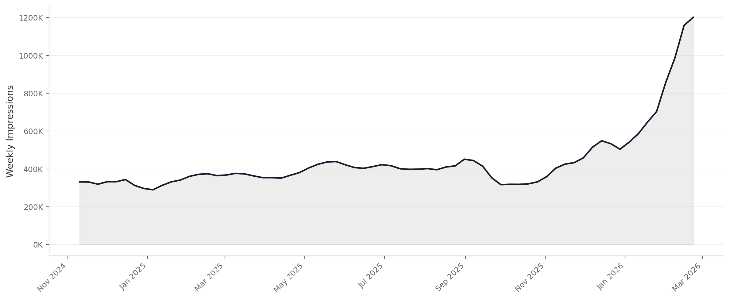Website impressions, weekly, from Nov 2024 - March 2026